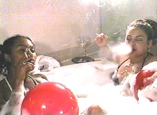 In "Best Friends 2," we see the duo in four settings: chatting and smoking on the bed (the voyeur cam makes a reappearance here, staring in through the girls' window); chatting and smoking in colorful kimonos before getting into the tub; and then twice in the tub, the second scene including a bubble bath and some playing with balloons.